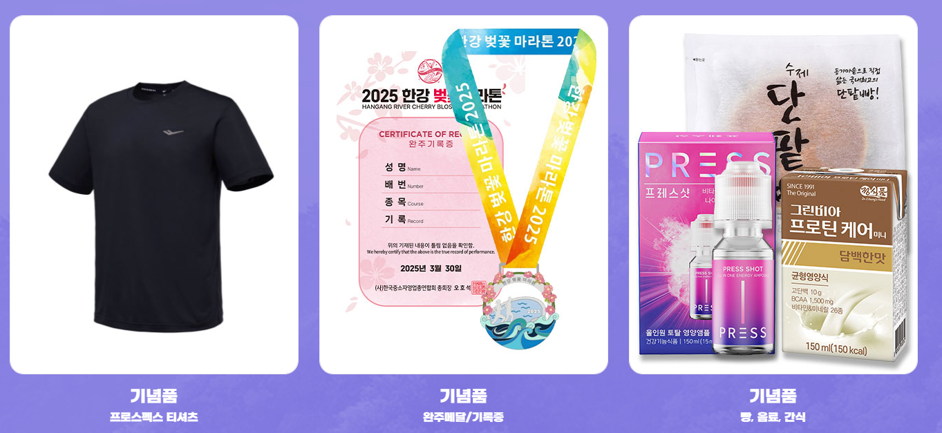 마라톤 참가자들에게는 기념 티셔츠, 완주 메달, 기록증(하프 및 10km), **간식(빵 & 음료수)**가 제공된다.
